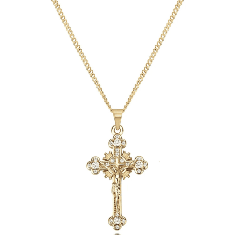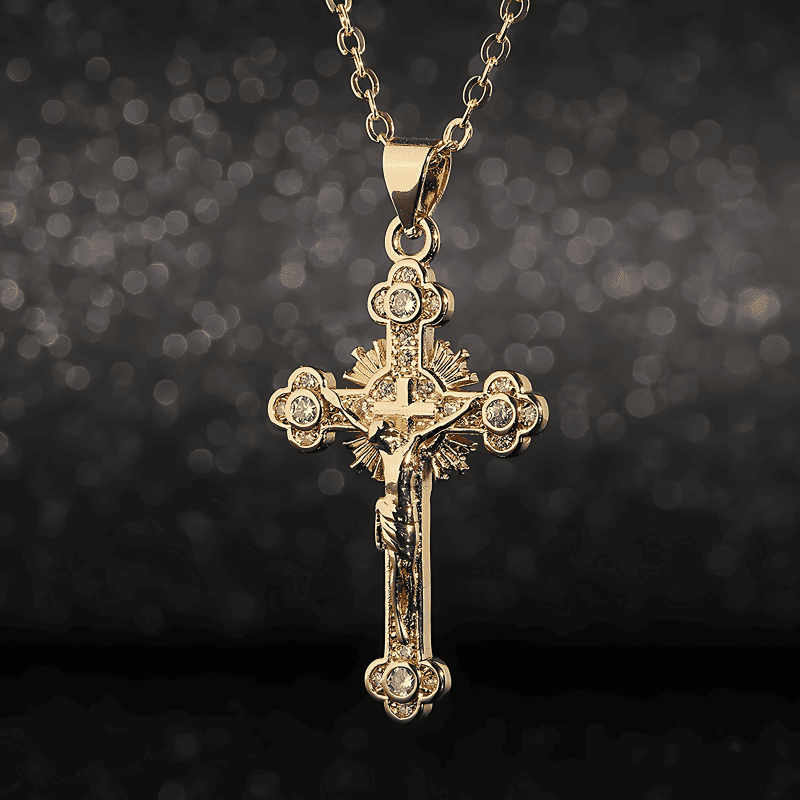 Este collar unisex, con colgante de cruz y acabado dorado con incrustaciones brillantes, es perfecto para quienes desean expresar su espiritualidad con estilo y elegancia.