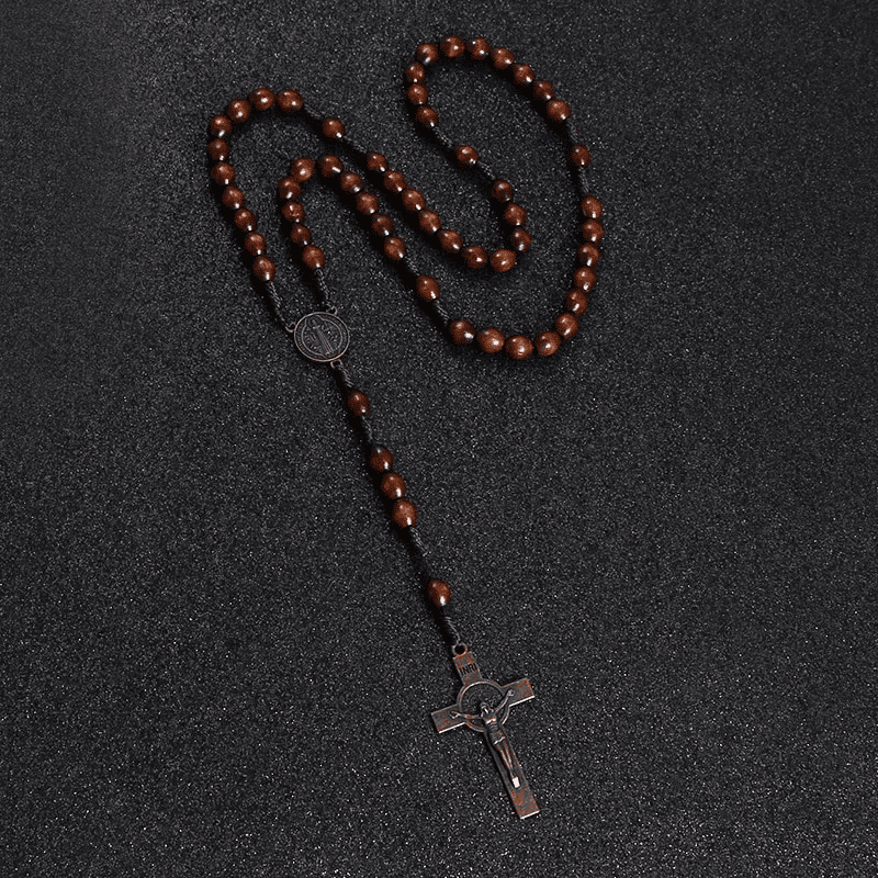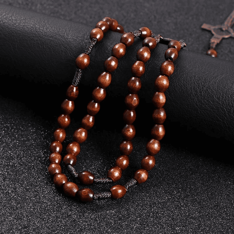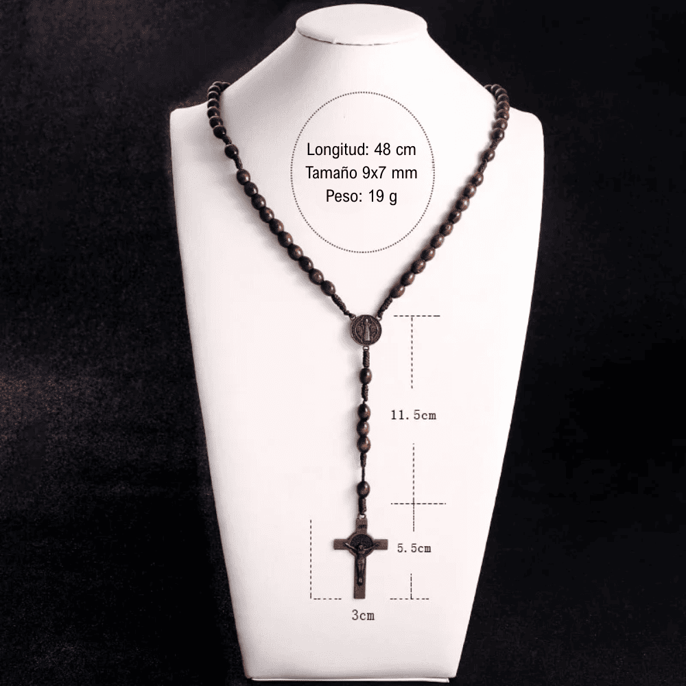 Este rosario es una expresión de fe profunda y tradición, conectando lo divino con lo terrenal a través de cada detalle. Sus cuentas de madera, junto con los acabados en bronce envejecido, transmiten serenidad y espiritualidad en cada oración.
