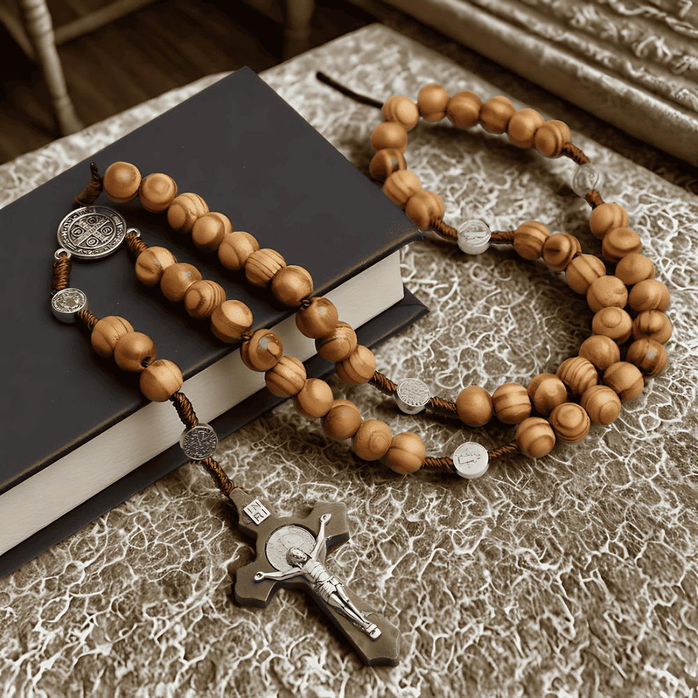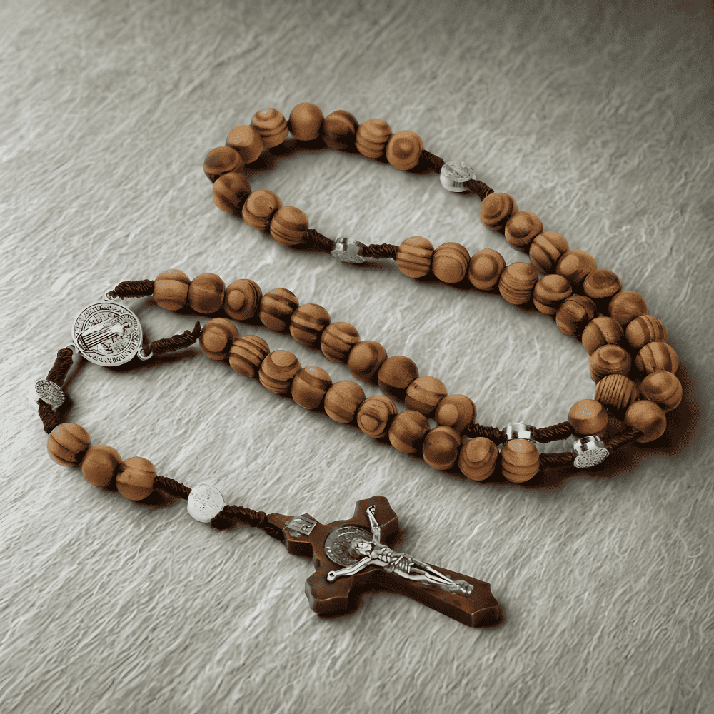 Con cuentas de madera de alta calidad de 10 mm, este rosario incluye un crucifijo con la inscripción INRI de 5,5 cm × 3,5 cm y una medalla de San Benito, que aportan un mensaje profundo de esperanza y protección.