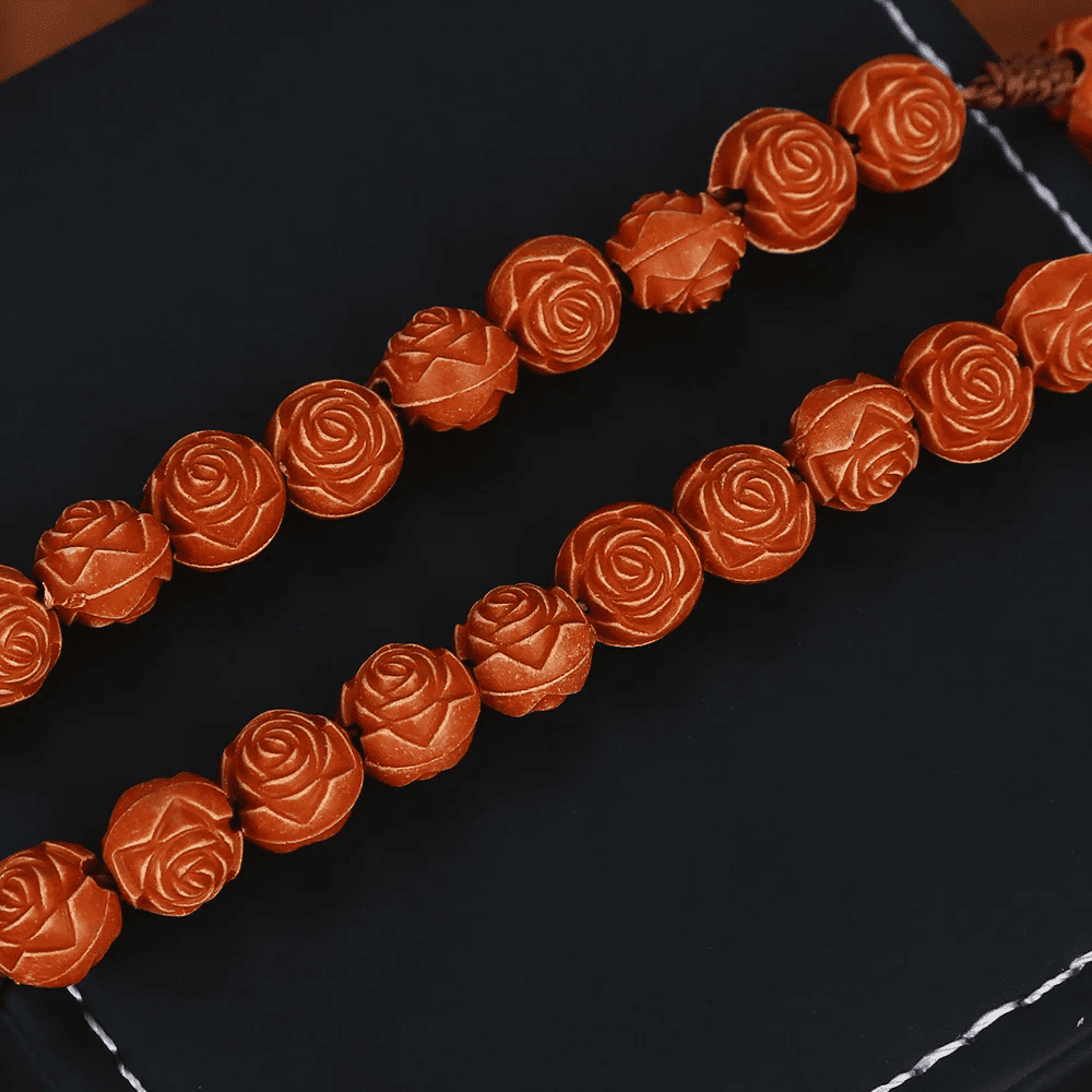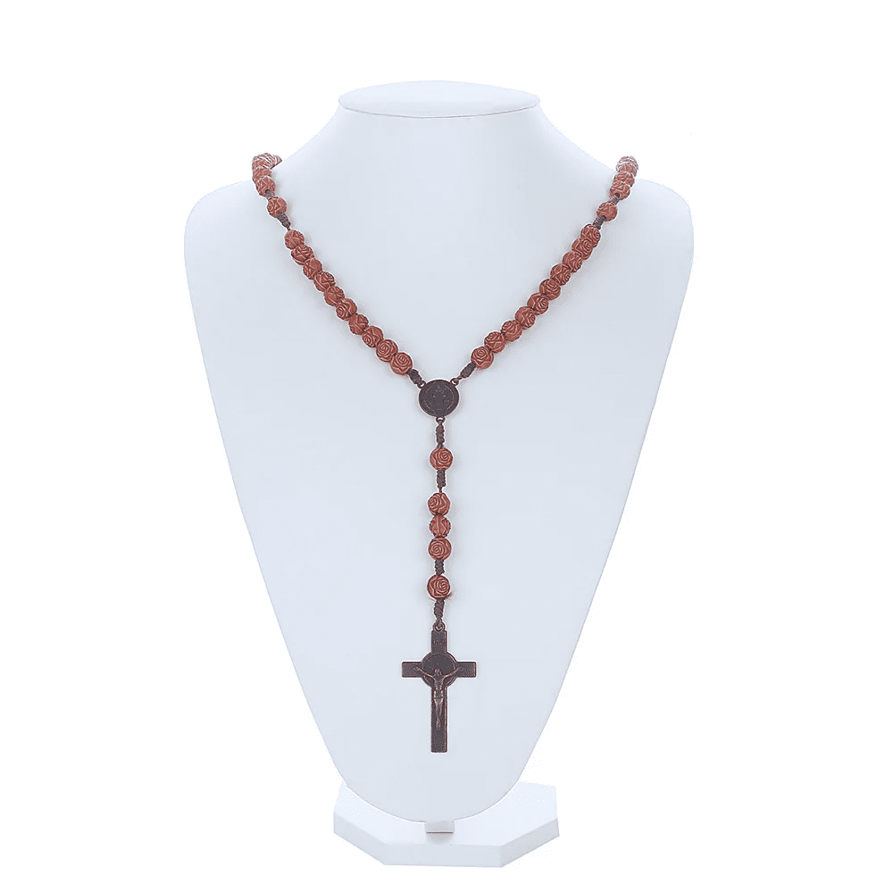 La cruz central, con un tamaño de 5 × 2 cm, simboliza el sacrificio de Cristo y la bendición constante sobre los fieles. El rosario se extiende hasta 57 cm de longitud total, con un segmento especial de 17 cm que conecta la cruz a la imagen de la Virgen María, reforzando su carácter protector y profundamente espiritual.